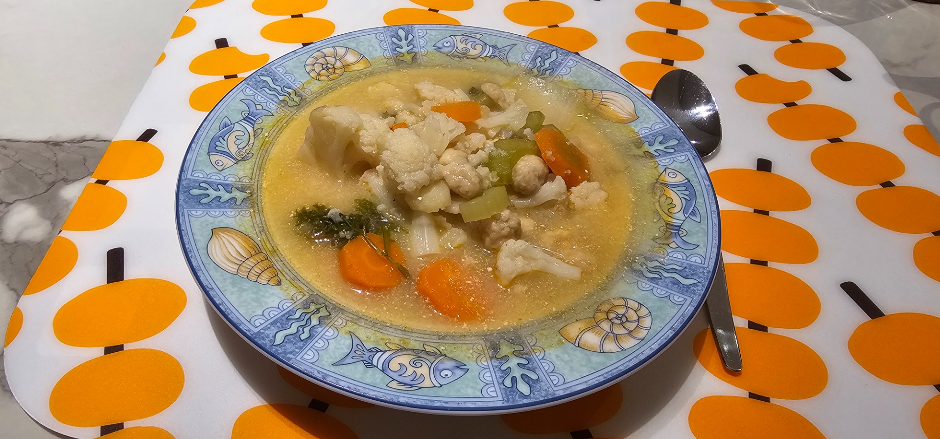 - Megpucolok és felkarikázok 2 db fehér- és 4 db sárgarépát. Egy vöröshagymát megpucolok és félbe vágom. A zellerszárat megmosom és felkarikázom (lehet zellergyökér is). Ezeket mind egy lábosba teszem, majd felengedem annyi vízzel, amennyi levest szeretnék (de minimum a duplája, minthogy ellepje és ne legyen túl magason a víz, hogy még beleférjen a karfiol is). Odateszem főni.
